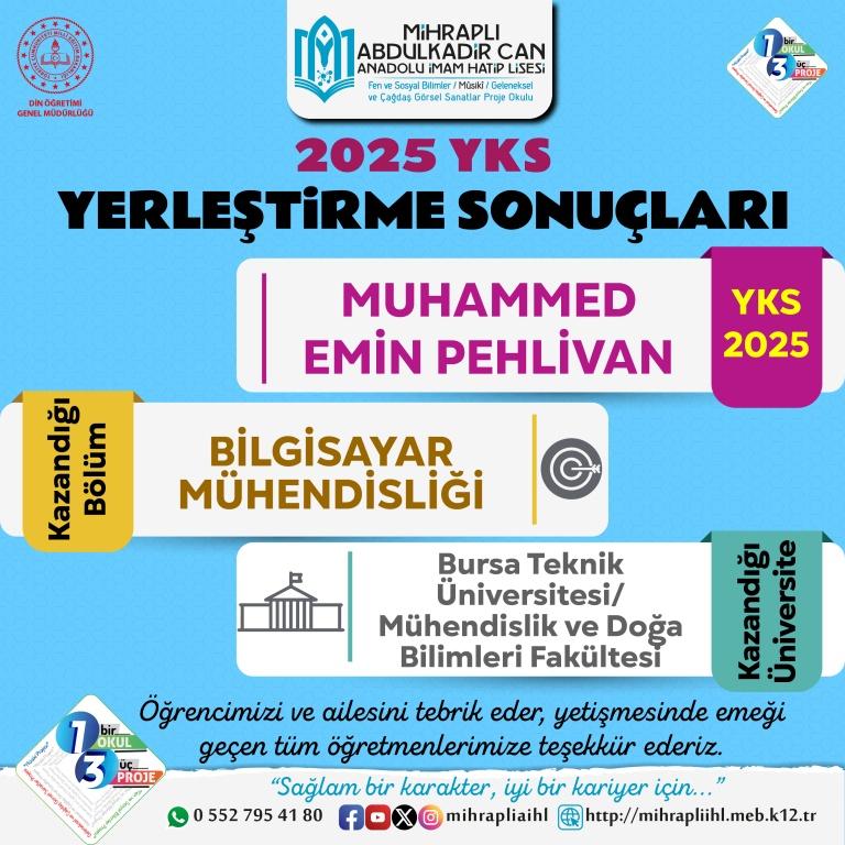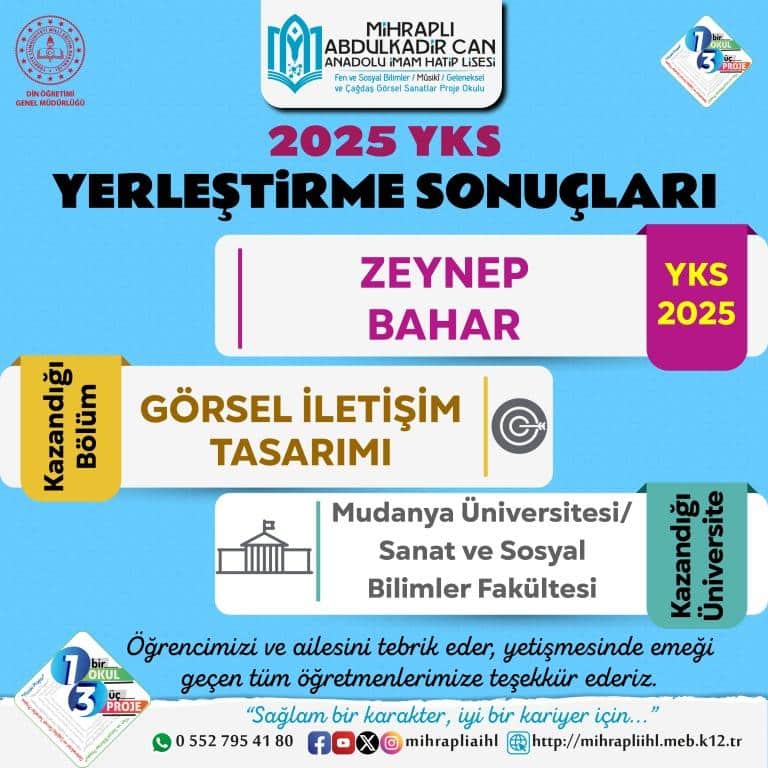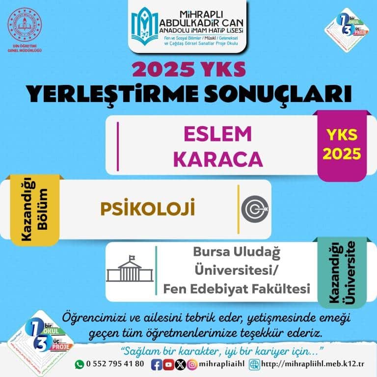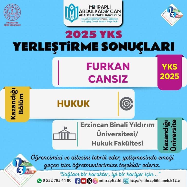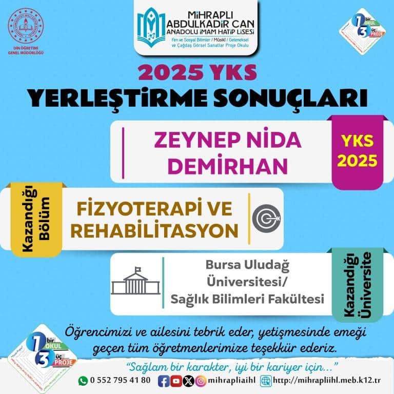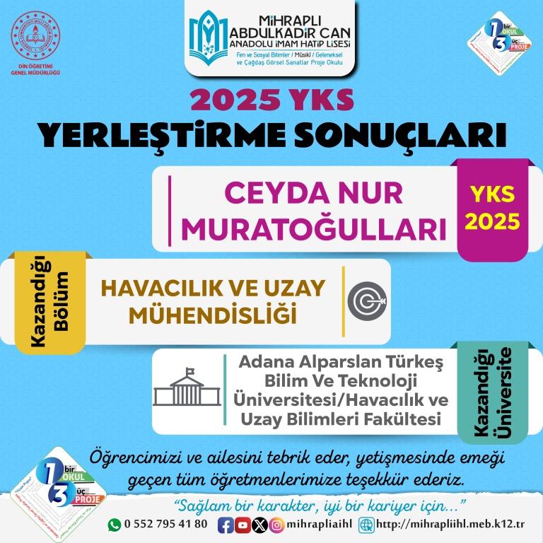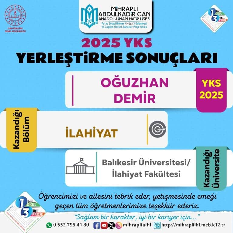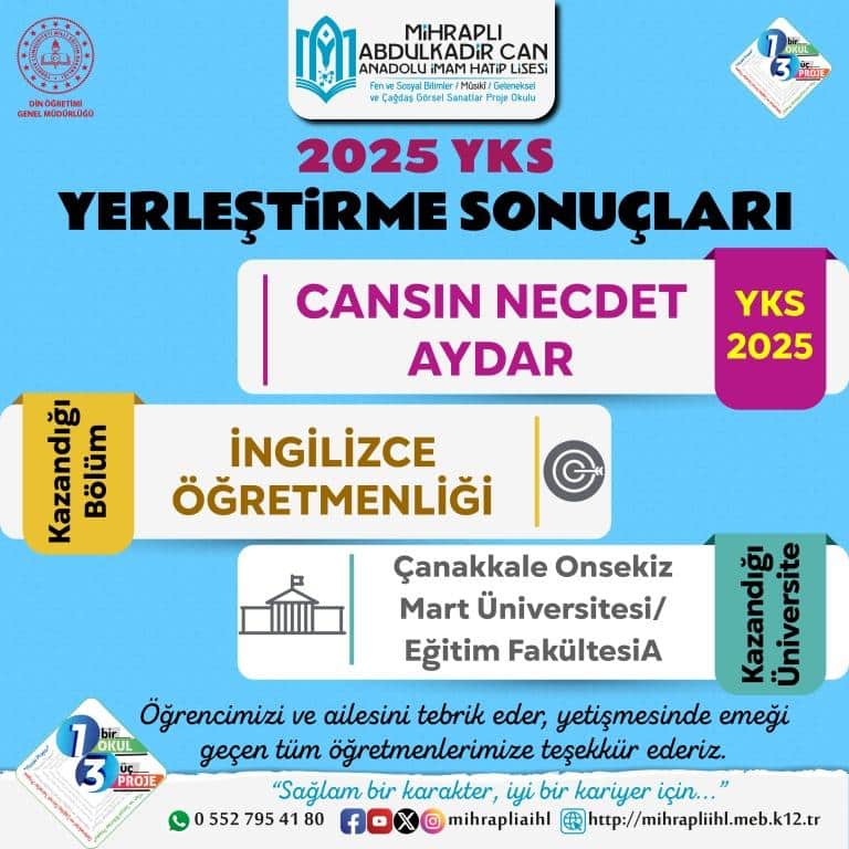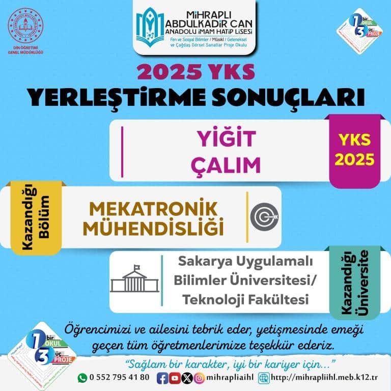 YKS YERLEŞTİRME SONUÇLARI AÇIKLANDI! Öğrencilerimizi ve ailelerini tebrik ediyor, emeği geçen tüm öğretmenlerimize teşekkür ediyoruz. Sonuçlar için takipte kalın! "Sağlam bir karakter, iyi bir kariyer için" çalışmaya devam ediyoruz.