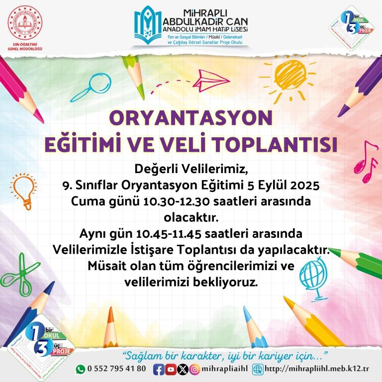 9. Sınıflar Oryantasyon Eğitimi 5 Eylül 2025 Cuma günü 10.30-12.30 saatleri arasında olacaktır.
