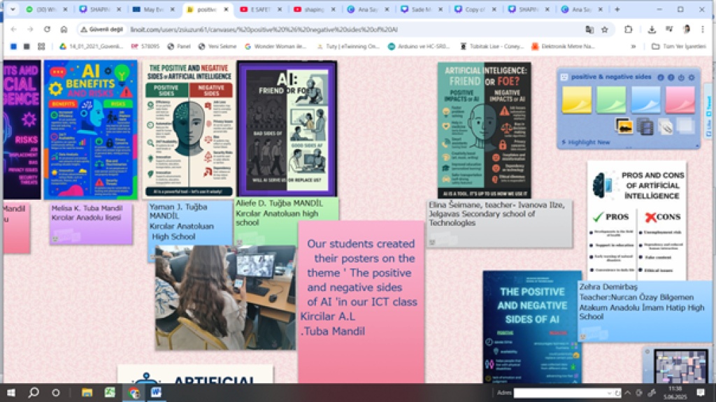 Okulumuzun e-Twinning projesi kapsamında, öğrencilerde farkındalık oluşturmak amacıyla yapay zekanın olumlu ve olumsuz yönlerini anlatan tasarımlar hazırlandı. İlgi çekici görseller ve kreatif çalışmalar, yapay zeka araçları kullanılarak tasarlandı.